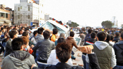 广东海门暴动升级 示威者推翻警车 血染高速路(图)