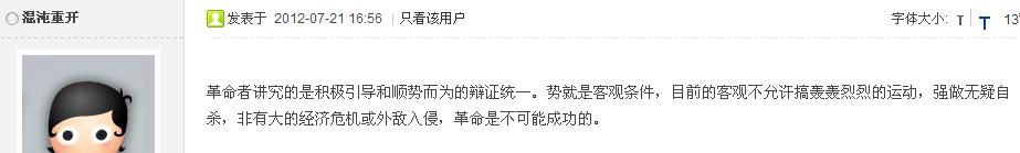 另外,你说中国目前的状况也决不是你说的经济上半殖民式的中国,而是实实在在的官僚资本主义,是已经达到垄断的帝国主义。而且在处理国际事务中发挥着比老牌帝国主义,如英法意荷比等国更大的作用。这与大清未期和民国时期外交主权被帝国主义控制一样吗?   王二麻子 发表于 2012/1/9 23:17:00    |