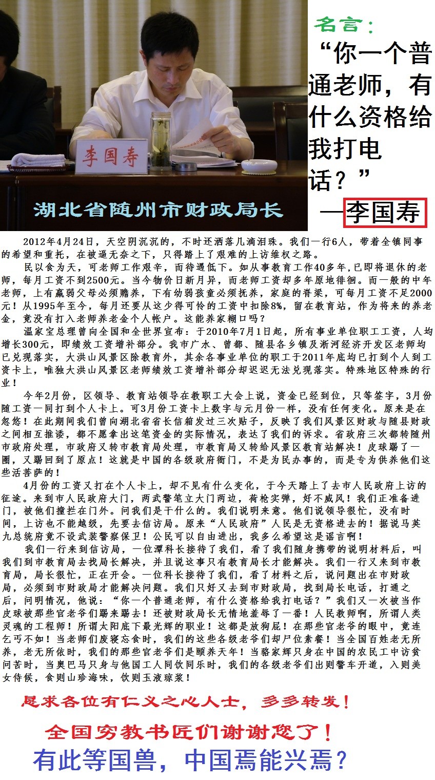 过去毛泽东时代共产党的干部一切都是为人民服务,老百姓找共产党干部解决问题要去农村田畈里去找,而今所谓“改革开放”三十年来出现的都有是怪现象,找“共产党”的干部解决问题要到宾馆饭店里去找,要到娱乐埸所里去找,这些所谓“共产党”干部他所想到一切为了自已升官发财,吃,喝,嫖,赌,贪,那里会去干点正事呢?该文所提到本市的一个教师为了工资一事需要向市领导提一下意见,所得到的回答:没有资格直接向有关领导反映情况,世界上境还有如此“混账狗部”,现在“共产党”的官员没有一个是好东西,这些官员比过去封建皇朝的贪官“和坤”还要“有过之而不及”一百倍,中国所谓“改革开放三十年”其社会对中国多大数老百姓作用而言要倒退不是一百年,而是一千年,这是中国老百姓的一大悲剧,贪官们的人间天堂,不法老板们的乐园。《共和国的摇篮》