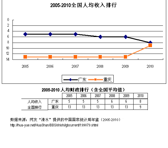 2.重庆的人均收入在全国的排名顺序发展趋势是上升,而广东则是下降——凉水洗JB,越来越抽抽。