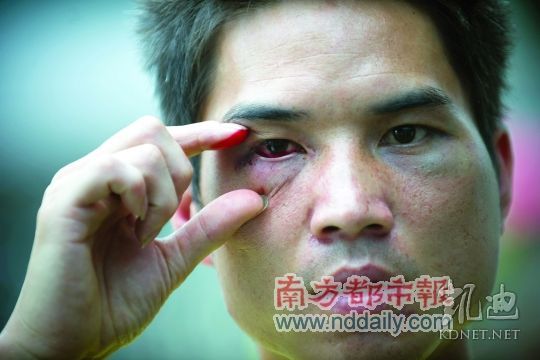 昨天上午,27岁湖南打工者皮某眼青脸肿,坐在深圳市龙岗区六约派出所的接待室等待处理结果。昨日凌晨的被殴过程在他脸上留下不少印记,他右眼充血布满血丝、左眼下淤青,左脸颊高高肿起,左嘴角破裂,颈部还有不少抓伤的血痕。