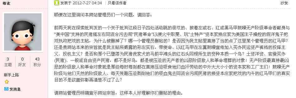 前两天我在探索批判发的一个关于批判这段日子四处活动跳的很欢的、披着左或右、红或黑马甲鼓噪无产阶级革命者献身与“美中国”支持的民猪搞左右同流合污去闹“民猪革命”以便火中取栗、玩“土特产”资本家换庄家为美国主子操控的假洋鬼子把戏执政把戏的主贴,为什么被删掉了?哪一个管理员删贴的?是否因为我主贴里直接了当的点了这里某个管理员的红马甲?还是贵网站本来的宗旨就是我主贴所揭露的形左实右,带使命、以红马甲在左翼鼓噪宣传加入买办民运资产裤裆的投降主义、投机主义?是否和那个已堕落为民猪丧家犬的马前卒滩头的红石头同根所生的变种本质一个鸟?土资洋资、官僚买办(民猪)、一般或自由资产民猪,都不是好鸟,都是被压迫的无产者的凶恶阶级敌人和革命埋葬的对象!无产阶级最直接最凶恶的阶级敌人和革命对象就是那些每时每刻都在直接压迫吸食他们血汗劳动的中外大大小小的资本家和工厂主们!鼓噪无产阶级与他们天然的阶级敌人、每天残酷压迫剥削他们的吸血鬼去同流合污闹民猪的换资本庄家把戏的内斗的红马甲们的真实目的不是欲盖弥彰再清楚不过了么?