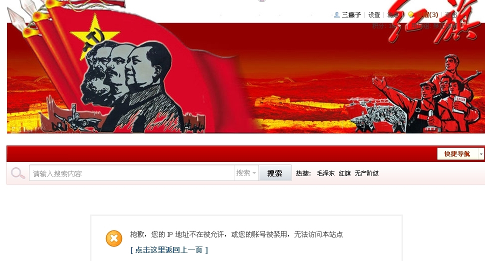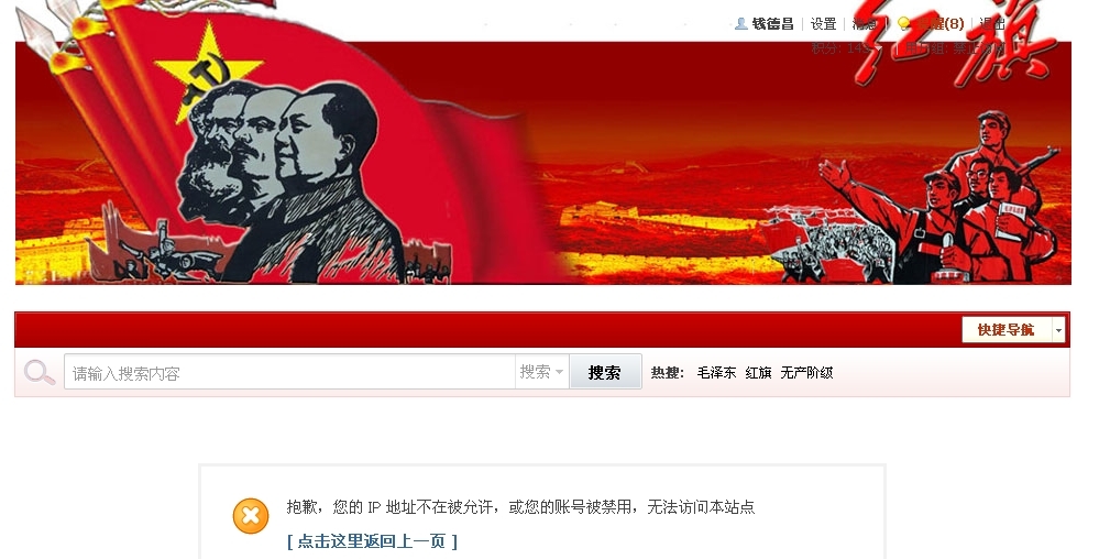 回复 10楼红山茶的帖子“红旗”网管理员HQ是反革命,也封了我的2个IP,原因就是我主张新民主主义革命。向导 发表于 2012/8/7 14:53:00