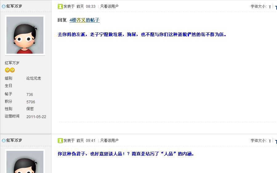 以上两图片中第一个图片是红军万岁对楼主文章回帖;第二个图片是网友齐义对红军万岁帖子的回帖。这就是两人争论的开始。