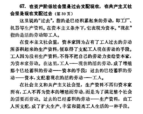 另一方面,馬克思同時也排斥了某的諸如"資本家之所以富有由於他們的勤勞"之類的說法,現實正恰恰相反,資本家所掌握的資本本來就作為其他勞動者辛勤勞動的結果,但這不是說現有的生產資料是當前勞動的結果,而是自有人類歷史以來所有前代人勞動的結果,資本家的辛勤只造成了佔有生產資料的結果.