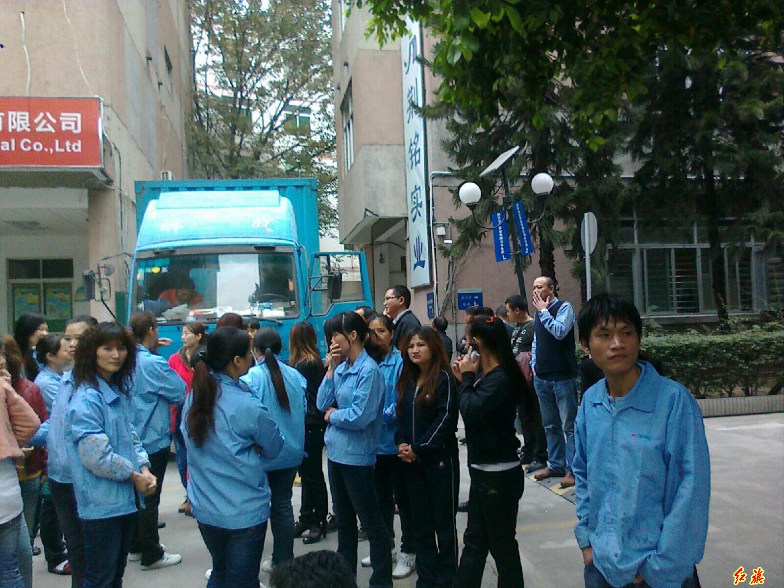 2013年1月26日,深圳市南山区,旭日东方实业公司,全体员工因不满薪资待遇发起罢工。员工在公司楼下举起横幅写着:“黑心老板”。罢工一直延续到28日仍未解决。