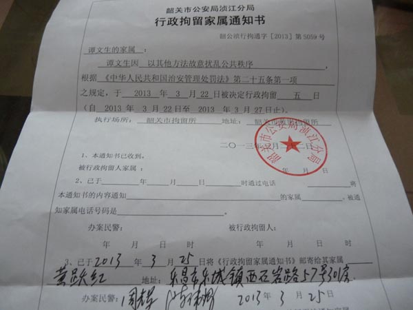 当晚,在韶关浈江分局的国保大队又做了一次讯问笔录,继革同志也不断地给他们耐心讲解革命理论,约23时,他们对继革同志作出了拘留的决定,并开出了第一张拘留证,内容为“涉嫌张贴反动传单”,并要继革同志签字,继革同志要他们解释“反动”的含义,他们无法回答,继革同志拒签,继革同志说,是否不签就可以不被拘留?他们说,不签也一样要拘留,继革同志说,那还等什么,爽快些,走吧,哈哈哈!随即便把继革同志押往拘留所,车开到一半,周大队长又接到局里一个电话,说要返回,随即又回到局里,他们又拿出一张重新做的拘留证,内容是"涉嫌张贴煽动性传单”,让继革同志签,继革同志说:煽动的内容是什么?比如,煽动群众卖地沟油、卖黑车、办假证,也是煽动啊。你只要把我宣传单上的任何一句话写上也行,比如,打到假共,推翻资本主义私有制等,我马上就签字。见无法达到目的,周辉、陈伟辉便又把继革同志押往拘留所,共拘留5天,继革同志于27日早上出所回到家。