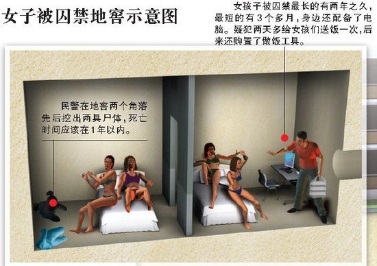 民警搜索地窖后发现,李浩挖出的地窖共分为两个小间。让他们惊讶的是,被囚禁的女孩子身边还配备了电脑。郑胜利和其同事介绍说。女孩们被解救后,民警按掌握的情况,在地窖的两个角落中,先后挖出两具尸体,据初步分析,死亡时间应在一年以内。