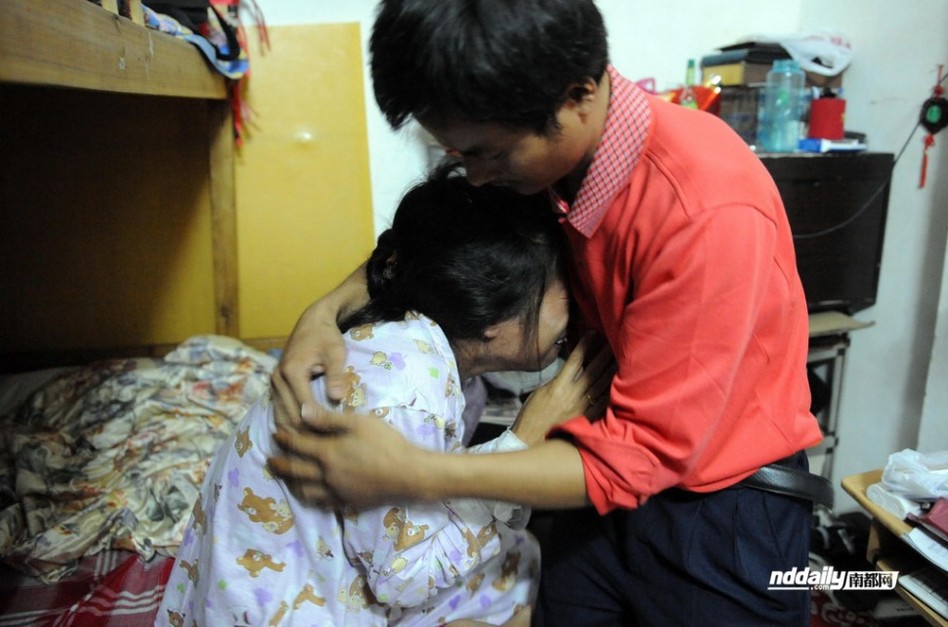 7日中午,西乡河东社区,杨武(化名)和妻子王娟(化名)绝望无助相拥而泣,她手腕上自杀的伤口被纱布抱着。