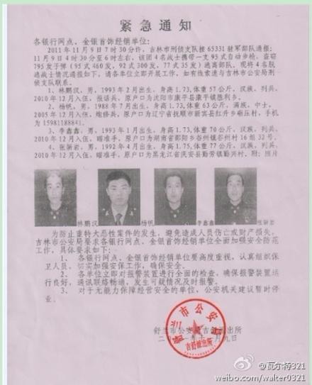 » 解放军驻吉林某部4名士兵携枪795发子弹出逃