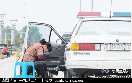 路边警车伸出一脚享擦鞋 网友叹“公仆形象伤不起”,“里面的爷也不出来露个脸?”一辆悬挂警车停在浙江省衢州市,一只脚从警车伸出来,擦鞋妇女坐在车门口低头擦鞋。网友谴责警察“太大老爷”。福建省南平市公安局表示,此事已在核实,车属于福建省南平市浦城县法院。