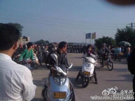 头带帽子,身穿防弹衣,左手拿大盾,右手拿T形刚棍(最少来了千余人)。。。这些特警下车就全部小跑到村民和当时警查打架的地方和他们打起来了,村民们毕竟没有经过特殊训练,手里拿的都是铁棍,木棍,农用工具和这些特警打起来当然是吃亏了,好多村民打不到特警,在前面的村民好多都被打的头破血流,有的打的躺在地上,警查直接从他们身上踩过去打别的村民,于此同时6点左右,当时的警查就把这个村庄和我们这个是村民土地的工业区包围了,从工业区入口高速公路下路口封锁了,拉了警戒线,车辆不得前进只准掉头,在从工业区的后面那个同茂工业区入口路口封锁了,