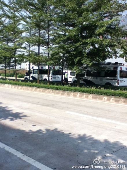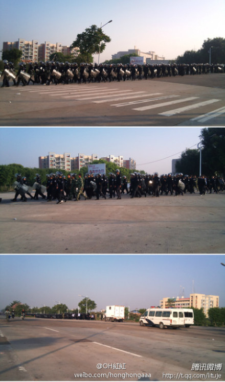 里面调来了,很多突击,防暴警查。。。警车全部停在我们厂中间的马路上,四辆车一排,中间留着。。