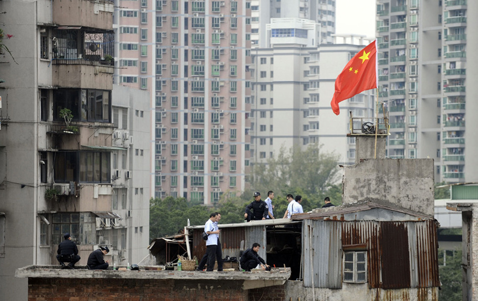 法警强行登上“钉子户”二楼,撬开门窗,进入屋内抓捕屋主。2011年11月17日上午9时许,广州五羊新城,法院强制执法,拆除杨箕村最后几栋“钉子户。南都记者陈辉摄
