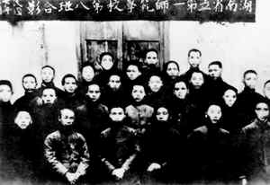 图1:湖南省立第一师范学校第八班合影。第四排右二为毛泽东,第五排右一为周世钊
