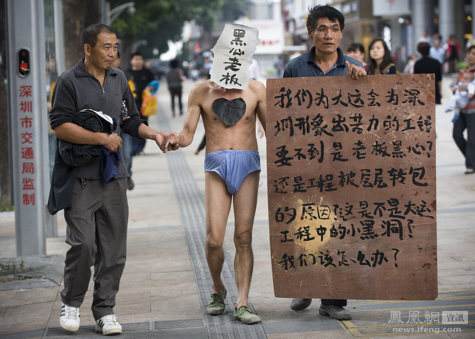 11月22日,深圳,在东园路上,老吕只穿一条内裤头戴面具“黑心老板”走上大街,他们只是为了讨要承包方欠下的20多万工钱。 南方都市报/陈文才