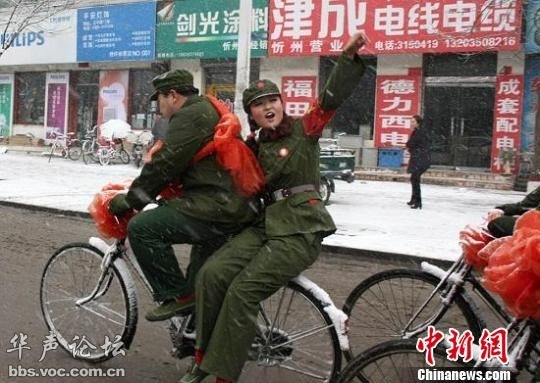 29日,山西省忻州市街头一名男青年身披“军绿”,戴着大红花,冒着鹅毛大雪,在一群“战友”的陪同下,唱着“向前向前,我们的队伍向太阳……”的歌声,骑着6辆“28自行车”组成了一支特殊的迎亲队伍。