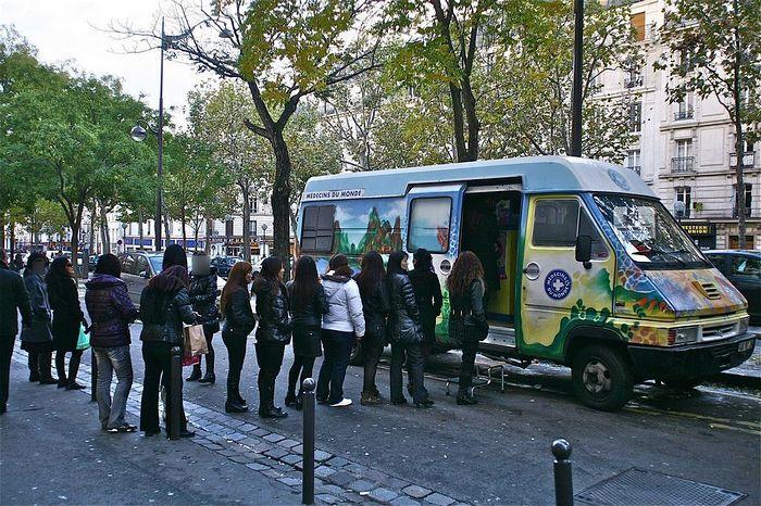 上图是,在巴黎的中国性工作者们接受“莲花巴士”的免费体检。莲花巴士是2002年由世界医生组织(MDM)所创建,目的在于为巴黎市区日益增多的性工作者提供免费的健康咨询和治疗。世界医生组织对外发布的数字称,在巴黎的中国性工作者大概有500人左右。