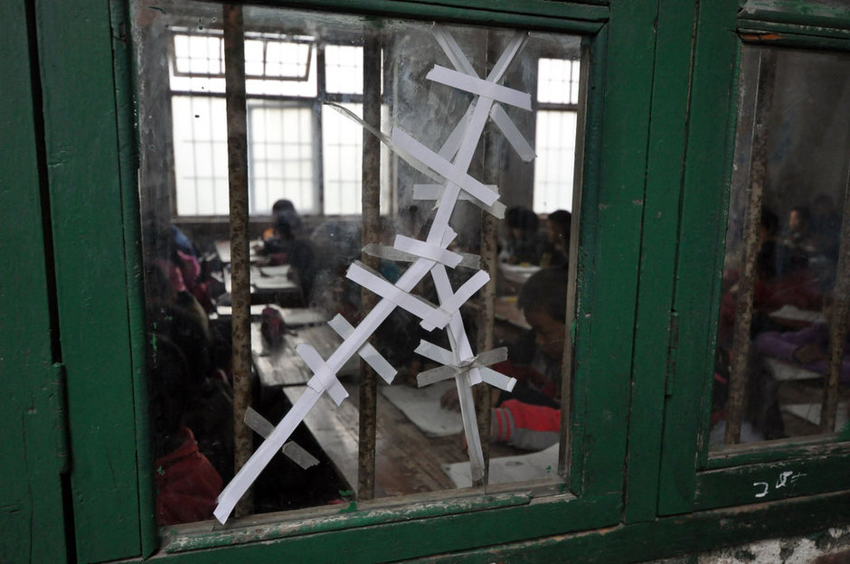 12月7日,广西柳州,柳北区行知小学里,学生用双面胶把破烂的教室窗户粘住。
