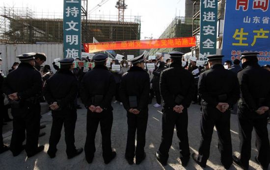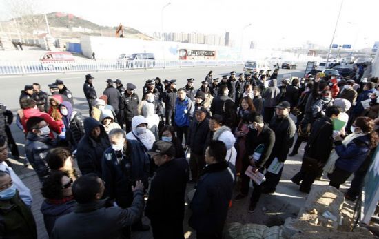 2月27日上午8时,山东青岛,200余名万科蓝山的业主聚集在楼盘旁边的变电站门前进行抗议,一群手里举着“尊重生命,还我绿色家园”牌子的居民堵在工地门口,现场有民警在维持秩序。图为业主冲到马路上希望能引起有关部门重视,后被公安部门拉回到人行道上。