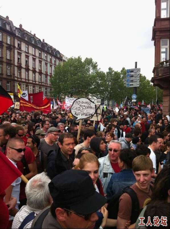 截至今天中午12点,反抗银行霸权和政治腐败的示威群众已经达到了三万人左右,反资本主义的群众们高唱着《啊朋友再见》(南斯拉夫电影《桥》主题曲),手持希腊国旗,以声援希腊的示威群众。斯洛文尼亚的群众被当局赶走了,但全欧洲的示威群众都来了,甚至还有法国的群众。尽管现场大批警察虎视眈眈,并未发生暴力事件。斯图加特也爆发了大规模示威游行。