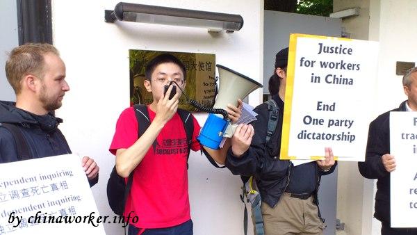 抗议者们手举李旺阳遗像、和“独立调查死亡真相”、“支持中国独立工会”、“为中国工人声张正义”和“结束一党专制”等中英文标语牌缓步走到中国大使馆前。