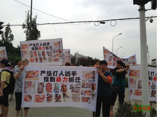 民生观察工作室2012年7月12日消息:今天上午,武汉市硚口区长丰村二百余居民将村口的马路堵住。居民们还打出写有“严惩打人凶手”、“抵制暴力拆迁”的多幅标语进行抗议。