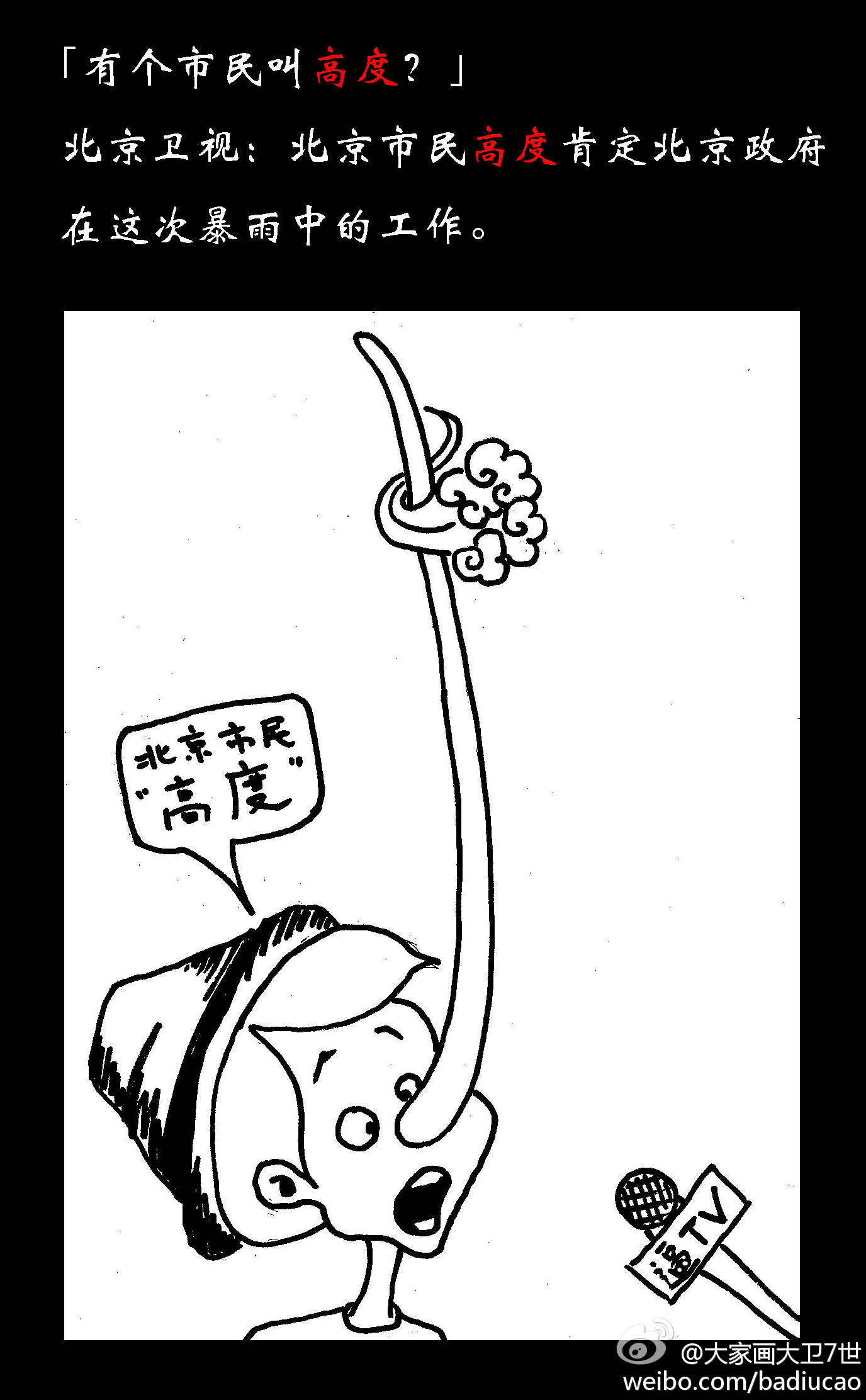 @大家画大卫7世 :@张志安 :【有个巿民叫高度?】据北京卫视报道:北京市民高度肯定北京政府在这次暴雨中的工作。新闻播出后,群众纷纷发起寻人行动,希望找到这位幽默的北京市民。高度兄,出来走两步?—— @大家画大卫7世 终于找到了【高度先生】,并为之造像。