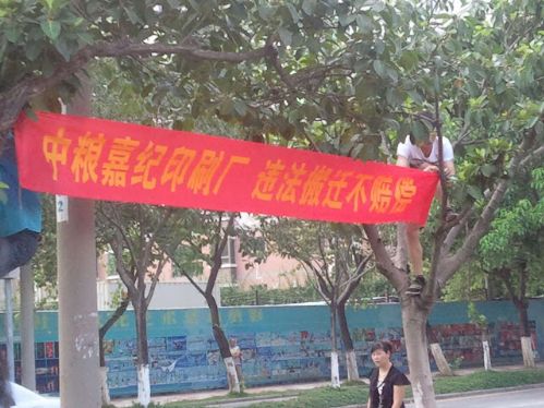 罢工工人堵塞工厂大门口,又挂起横幅写上“中粮嘉纪印刷厂 违法搬迁不赔偿”。大批警察在厂门外戒备,一度与工人发生轻微冲突。
