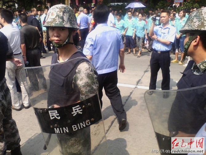 真是“战时参军参战”呀!据报道,8月9日上午,深圳市宝安区先歌工厂工人罢工,当局出动大批警察、防暴警察和准军事部队“维稳”。这不已经“参战”了吗?“准军事武装”的盾牌上赫赫印着“民兵”字样!