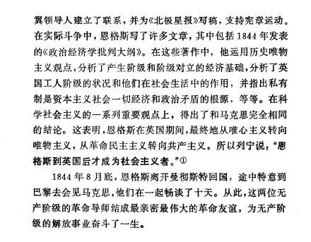 当伟大的无产阶级导师马克思逝世后,恩格斯是这样评价马克思一生的:他用精炼的语言概括了这位科学巨匠对人类的贡献,指出,唯物主义历史观和剩余价值理论是马克思的两个伟大发现,“一生中能有这样两个发现,该是很够了。甚至只要能作出一个这样的发现,也已经是幸福的了” 。他还强调指出,马克思首先是一个革命家,他毕生的使命就是参加推翻资本主义社会及其国家制度的事业,参加现代无产阶级的解放事业。正因为这样,马克思遭到了一切反动势力的诬蔑,诽谤和迫害。最后恩格斯说:“现在他逝世了,在整个欧洲和美洲,从西伯利亚矿井到加利福尼亚,千百万革命战友无不对他表示尊敬、爱戴和悼念,而我敢大胆地说:他可能有过许多敌人,但未必有一个私敌。他的英名和事业将永垂不朽!”