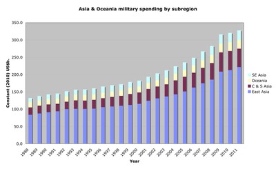 美国“战略重心重返亚太”和中国的海军建设,都在煽动亚洲军备竞赛。根据国际战略研究所指出,亚洲的军事开支今年将超越欧洲,是现代史上首次发生。去年菲律宾政府几乎将防卫开支提升一倍至24亿美元。在马来西亚的军备支出在2005到2009年间翻了八倍,而涉及南沙群岛争端的印尼的则在同期上升84%。各国政府正在获取和提升潜水军备的能力,包括印尼、马来西亚、新加坡、泰国和越南。东南亚国家的军事开支总和在2011年上升了13.5%,达到245亿美元。根据亚洲发展银行的资料。相比之下,只要每年80亿美元就可以确保整个亚太区有安全的饮用水,但现在有5亿人得不到安全的饮用水。这一例子表现了资本资义的浪费罪行,将公款用于军备支出而无视急切的社会投资。
