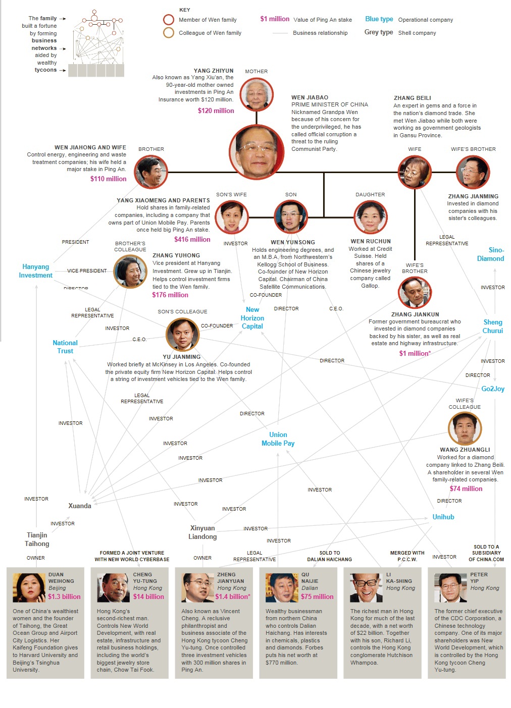 《纽约时报》的调查显示,温家宝担任领导职务期间,他的很多亲属变得极为富有,其中包括温家宝的儿子、女儿,弟弟及妻弟。对公司与监管记录的调查显示,在总理的亲属中,有些人的生意风格十分强势,他们掌控了价值不低于27亿美元(约合170亿元人民币)的财富。