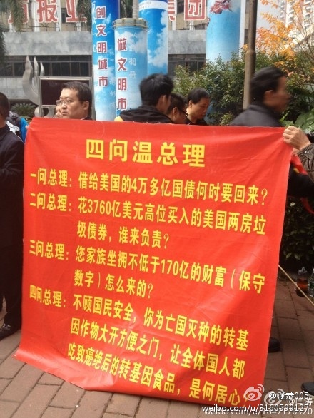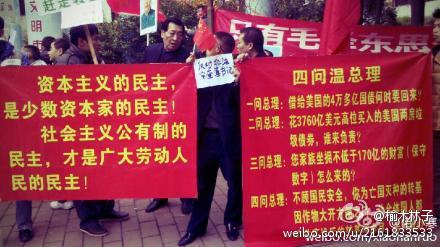 昨 天1.8日救党保国派去砸场子,标语写:“支持习近平,支持共产党”,的确有辱毛泽东的革命思想。今天1.9日,看到换了几个标语,似乎有所进步!特别是民主的标语,见下图,
