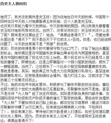 在英国,不仅这个所谓的”铁娘子”仇恨共产主义,曾被很多中国人“授予”二战领袖之一的邱吉尔就是一个反苏反共产主义的老手,他们对马克思和共产主义运动的憎恶与仇恨并不亚于法西斯党魁希特勒。但是,中国那些打着马克思主义旗号的特色党却对这些连身上的虱子和跳蚤都插着反苏反共反马克思主义旗子的英国帝国主义分子们佩服得五体投地!这恐怕也是近代史上的一大奇观。