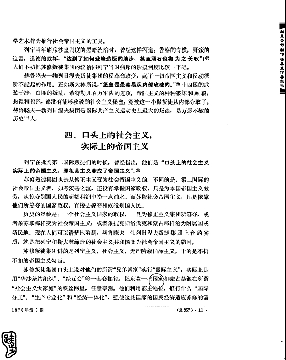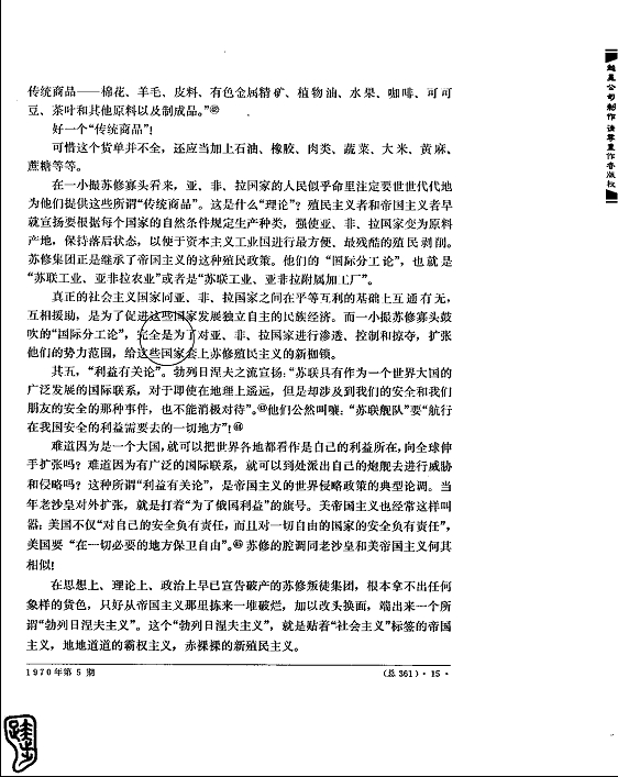 “现在,随着时间的推移,出现了一些新变化,自从中国的官僚资产阶级在其文本中,出现反对‘西化分化’之类的字眼后,中国的张宏良及其庸虿们,就开始从破旧的老字典中翻腾出原来‘西化’、‘西化派’的词句,并给之特意贴上民族主义的标签,他们这样做,恰如他们臆造出来的‘左派带路党’一样,其目的是为了保皇,喧染民粹主义,以便维护官僚资产阶级的统治。”