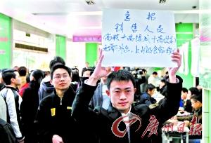 广州的招聘会现场,一家企业举起招牌招揽前来应聘的外来务工人员。 记者顾展旭 摄
