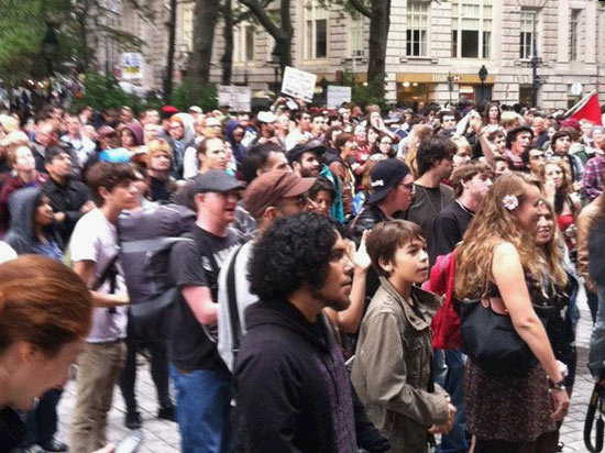 华尔街附近的保龄球草坪一时间成了示威者们的聚集地。群情激昂的人们在高喊“现在就革命!现在就革命!”的口号,更有不少人在高呼“要工作!要工作!”