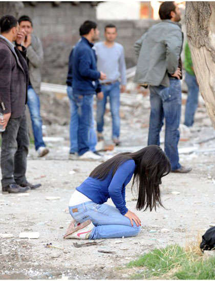 土耳其当地时间23日,地震重灾区凡城,一名女子在发生地震后跪地哭泣。