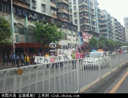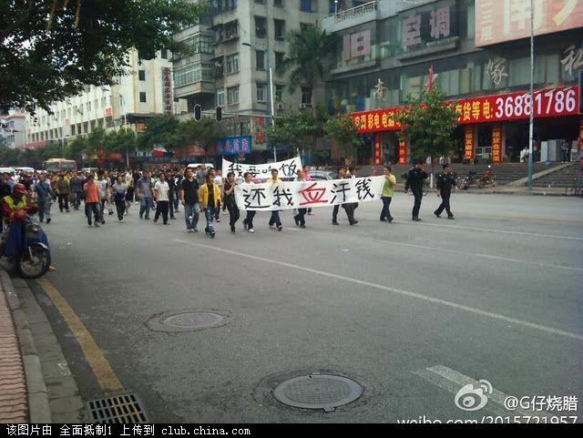2011年11月18日中午12点左右,广州花都建设北路有数百民工喊着口号游行示威,大大的横幅:“还我血汗钱”、“我要吃饭”,警察沿途开路护航、疏导交通,公交车要改道,造成交通堵塞。