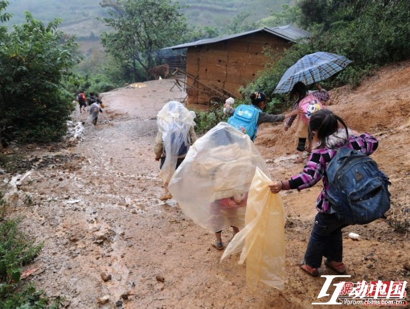 马头坡,放学路上披着塑料布回家的孩子。黄兴能 摄