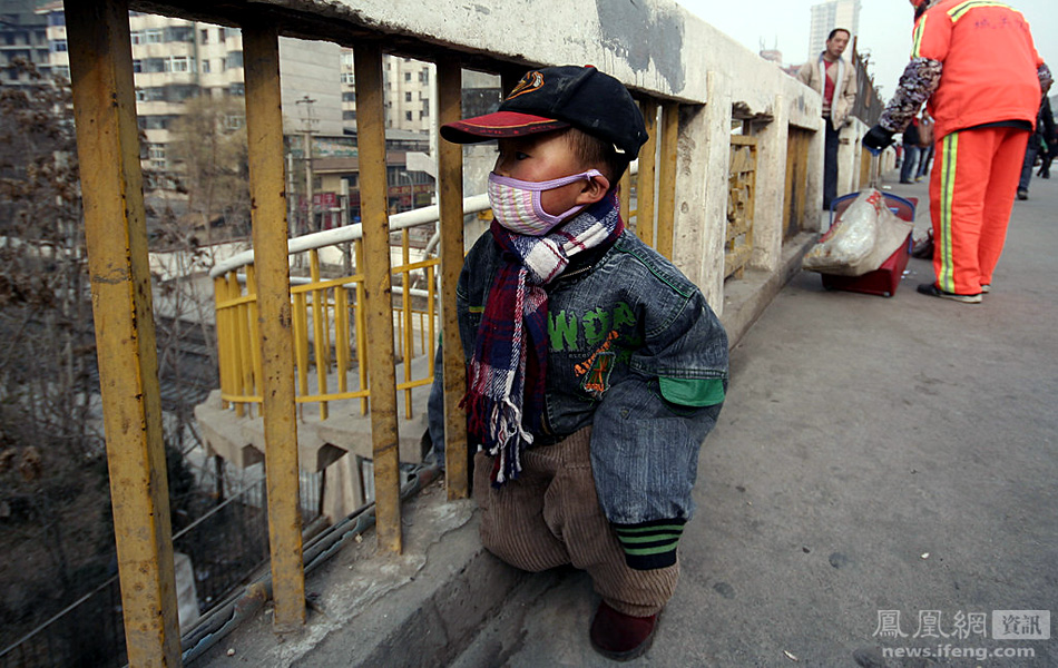 11月28日,甘肃兰州,五泉山公园附近天桥,清洁工尹大姐领着3岁的孙子勇勇在一同清扫马路。问其原因,则是因为她交不起每月500元的费用,无奈之下只能带着孩子一起上班,而勇勇每天最爱干的事情就是在天桥上数火车。 浅行/摄