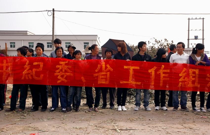 2011年12月21日,乌坎村事件出现转机,广东省省委成立特别工作组进驻乌坎村。图为乌坎村民拉横幅欢迎工作组进村。