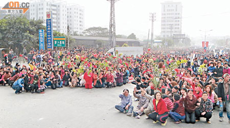 大批婦女手持樹枝下跪,促當局盡快放回被捕村民。(本報汕頭傳真)