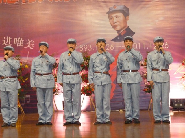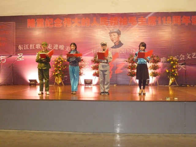 7点30分许,四位70、80后主持人庄严走上台,宣布“隆重纪念伟大的人民领袖毛主席118周年诞辰群众红歌会”正式开始!当主持宣布奏《东方红》,向伟大领袖毛主席敬献花篮时,台下的群众全场不约而同地全体起立,赶在主持程序前向毛主席行注目礼!这样的场面,任凭是谁见了,还会禁不住动容!