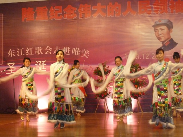 企业员工的舞蹈是让观众情绪高涨的节目,尤其是《北京的金山上》和《洗衣舞》,洁白的长袖在空中曼舞,划出道道优美的弧线!让人想起晴空的白云与藏族人民的哈达!把人们完全带入到了伟大的毛泽东时代那个令向往的社会!