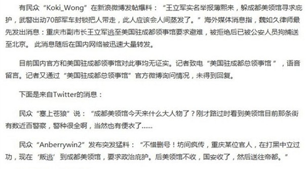 随后有网友称此次事件与刚刚卸任公安局长的王立军有关,该网友称:“重庆市副市长王立军逃至美国驻成都领事馆要求避难,被拒绝后已被公安人员拘捕送至北京。” 此消息随后在大陆网络被迅速大量转发。截止发稿时,“美国驻成都领事馆”与“王立军”都已成为微博关键词,不少网友也纷纷前往美国驻成都领事馆官方微博页面发帖质问真相。但经多维核实,目前北京官方和美国驻成都领事馆对此事均无证实。