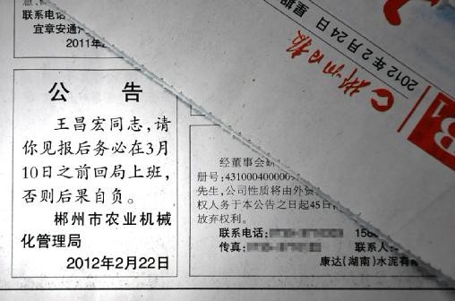 湖南郴州副局长闹失踪连续数月未上班单位登报寻人(图)