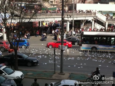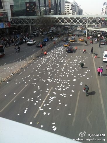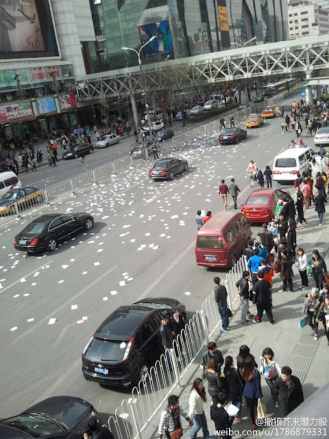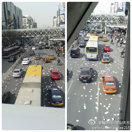 2012年4月3日下午,北京西单的行人天桥,两名上海冤民抛撒大量传单。传单飘得满街都是,汽车立刻慢下来,路人纷纷驻足围观,天桥上也站满了看热闹和照相的人。