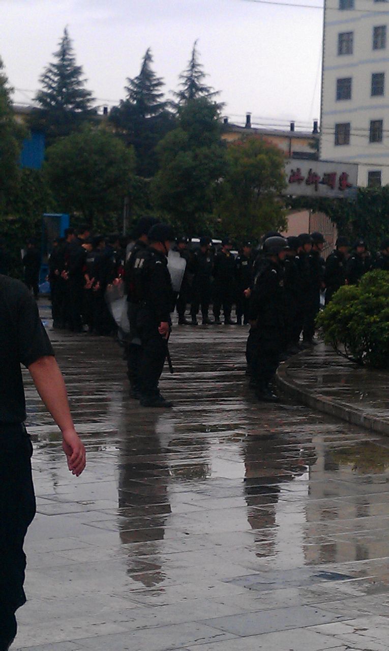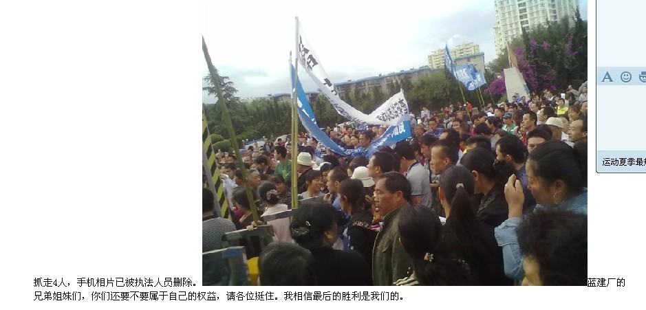 “抓走4人,手机相片被执法人员删除。蓝建厂的兄弟姐妹们,你们还要不要自己的权益,请各位挺住。我相信最后的胜利是我们的”。